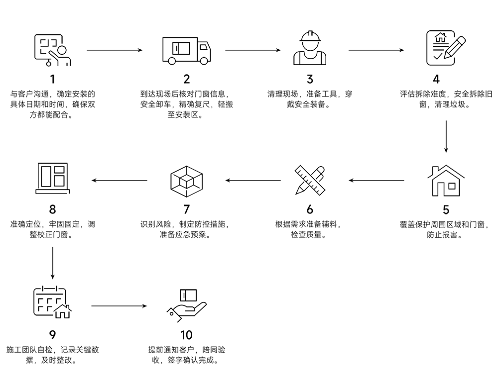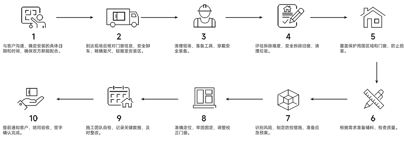 由于我们的门窗产品为定制产品,产品或部件故障以修理为解决原则,在可⾏的情况下,我们可能会先尝试通过网络、电话或其他远程帮助方式来诊断和解决您的产品故障。如有些问题可通过您自行操作方式解决,则我们会指导您如何操作解决。如上述⽅式不适用或无法解决问题,我们将安排服务工程师上门为您提供服务,如现场无法解决问题,需要拆除产品返⼚维修的,我们将告知您实际情况原因,同时需要您的支持配合。